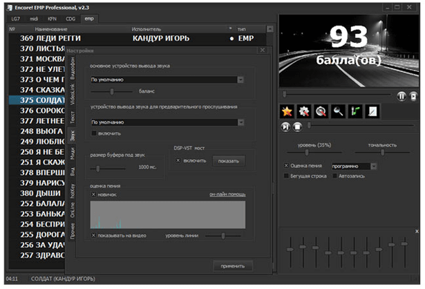 • Функция предварительного прослушивания фонограммы песни и просмотра её текста для с целью общей оценки клиентом качества фонограммы и её тональности с выводом звука на дополнительный звуковой интерфейс.