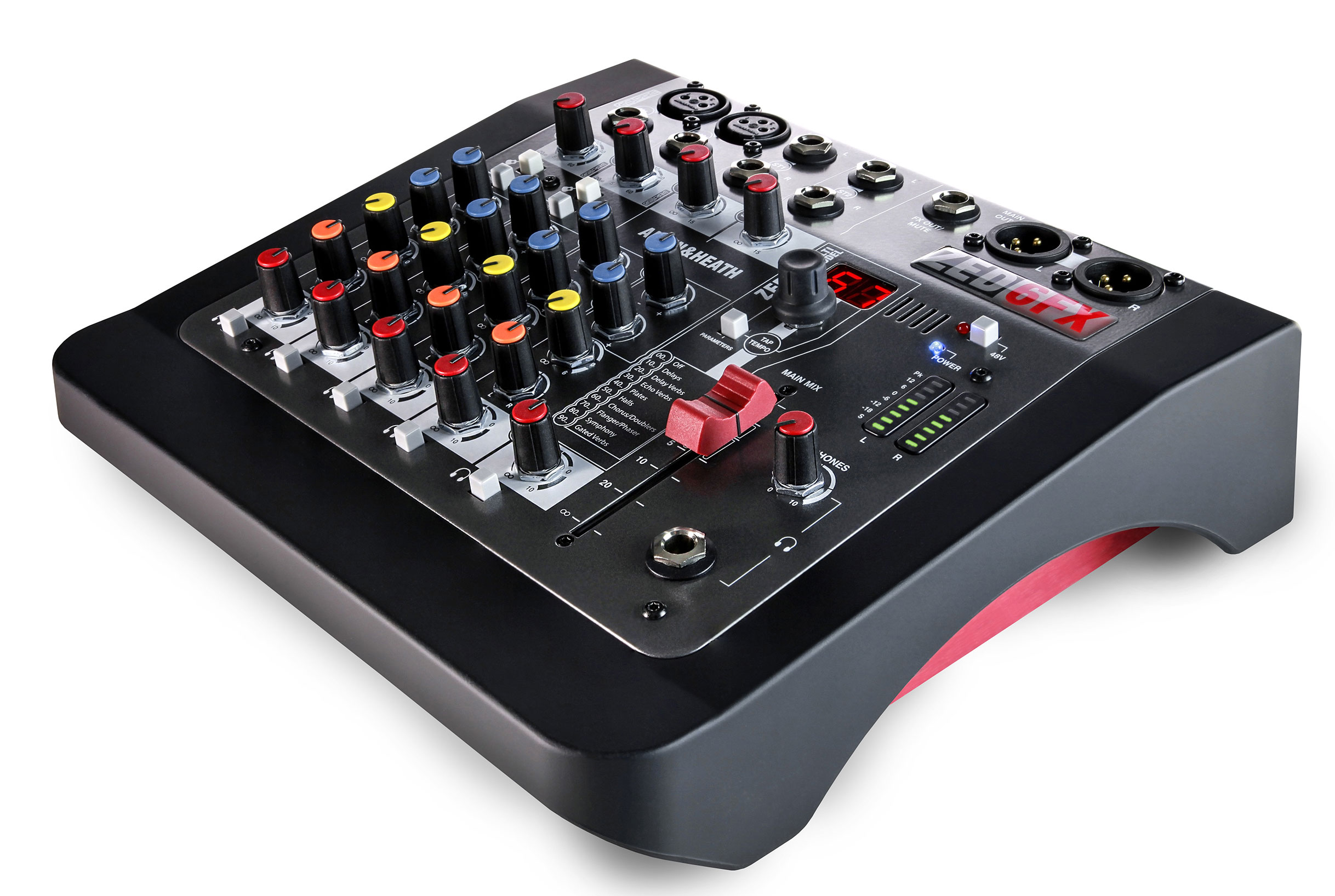 ZED-12FX имеет важный и необходимый выбор из 16 временных дилей эффектов, специально разработанных для тех, кто не хочет возиться с процессорами эффектов, но хочет иметь превосходного качества FX на концертах или на записи. Zed 12FX оснащен профессиональным процессором эффектов, использующим собственный алгоритм, разработанный выдающимися инженерами Allen&Heath. Диапазон эффектов – от классических Reverb до Flanger и Chorus. Выбор эффектов осуществляется нажатием кнопки интерфейса вверх/вниз, а интенсивность задержки может быть задана кнопкой TAP. Удерживание TAP позволяет настроить параметры эффектов. Аудио сигнал в DSP преобразуется с помощью 24-битных конвертеров высокого динамического диапазона, работающих на частоте сэмплирования 48кГц и обеспечивающих низкое искажение сигнала и “прозрачные” эффекты.