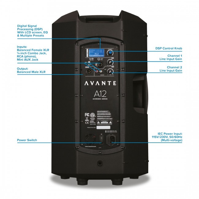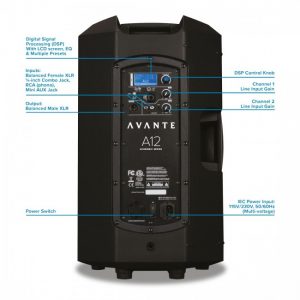 ADJ AVANTE12- Активная двухполосная акустическая система, пластиковый корпус, FOH/монитор, 12″ динамик, 1,35” HF компрессионный драйвер, 60Hz-20kHz, 350W Class D (LF) + 50W Class AB (HF), 430 x 420 x 700 мм, 17 кг.